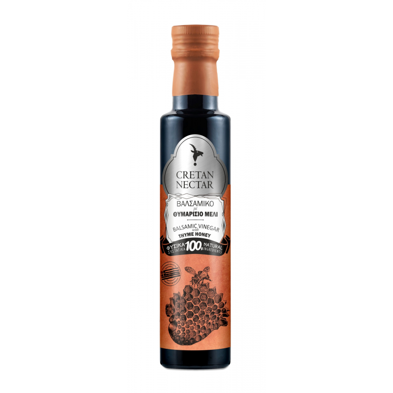 Vinaigre de moût de raisins rouges avec du miel de thym. Goût aigre-doux unique pour l'accompagnement des salades vertes et des viandes.